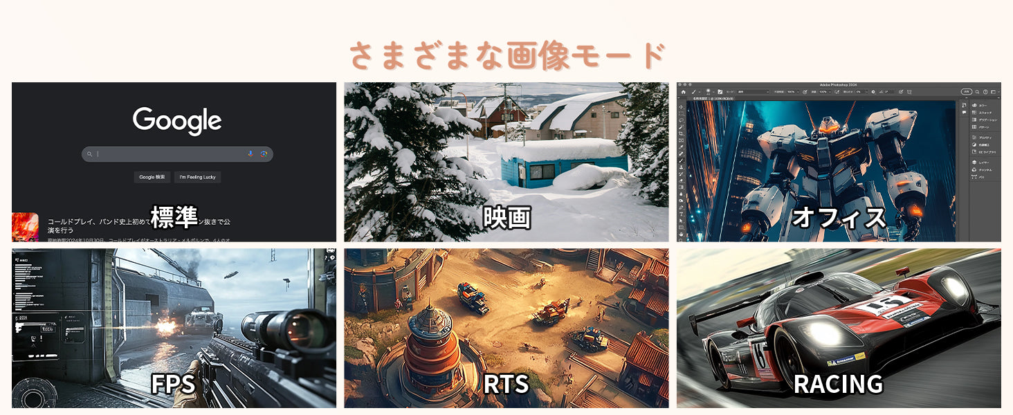 - [リフレッシュレート] 100Hz、[応答速度] 5ms、[傾斜角度] 22°/-5°、アイケア、ブルーライト軽減、フリッカーフリー、アダプティブシンク、[ゲームモード] RTS/FPS/レーシング/スクリーンアシスタント