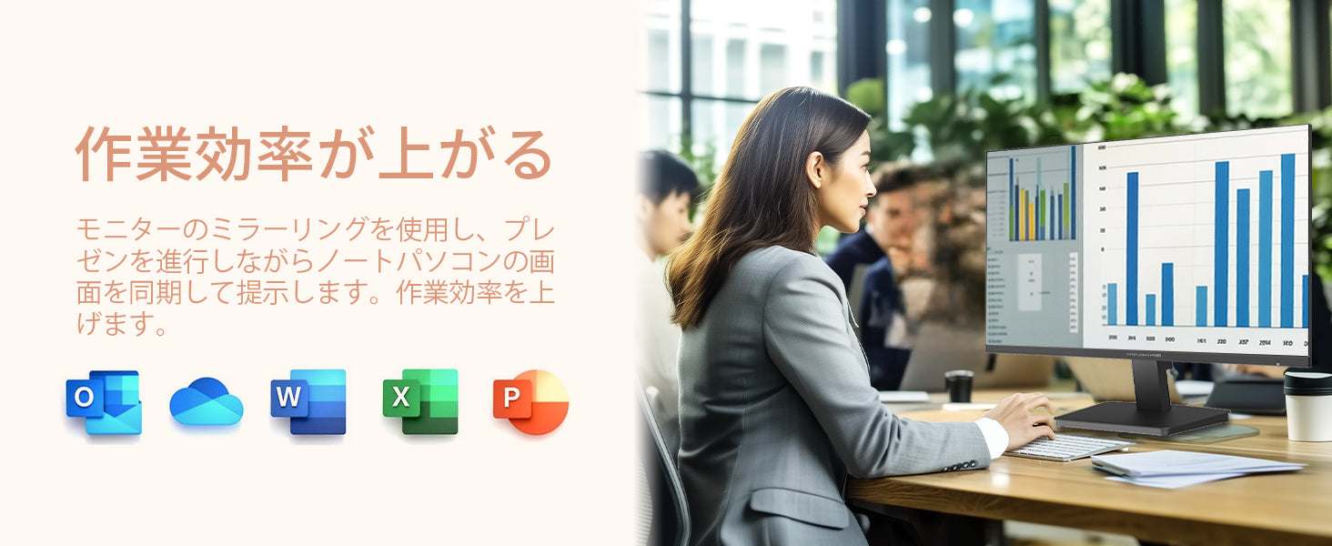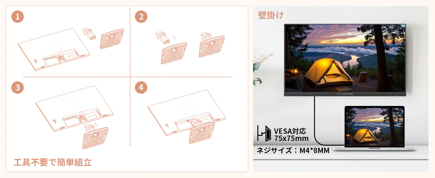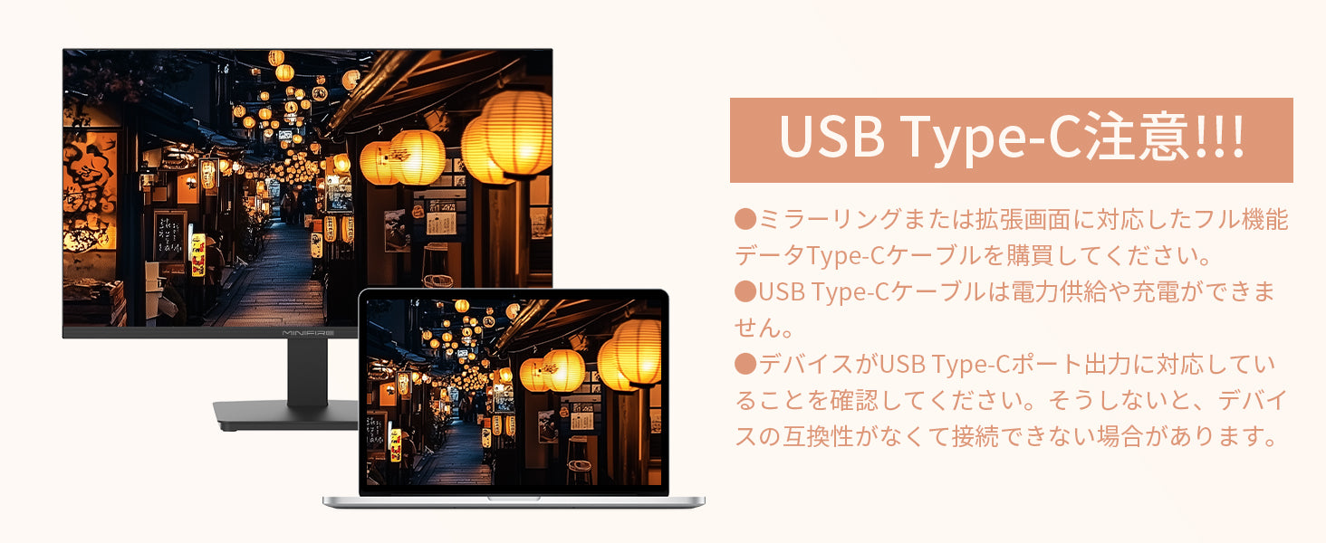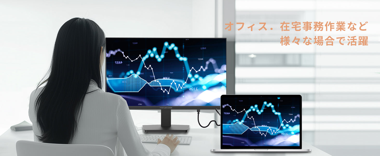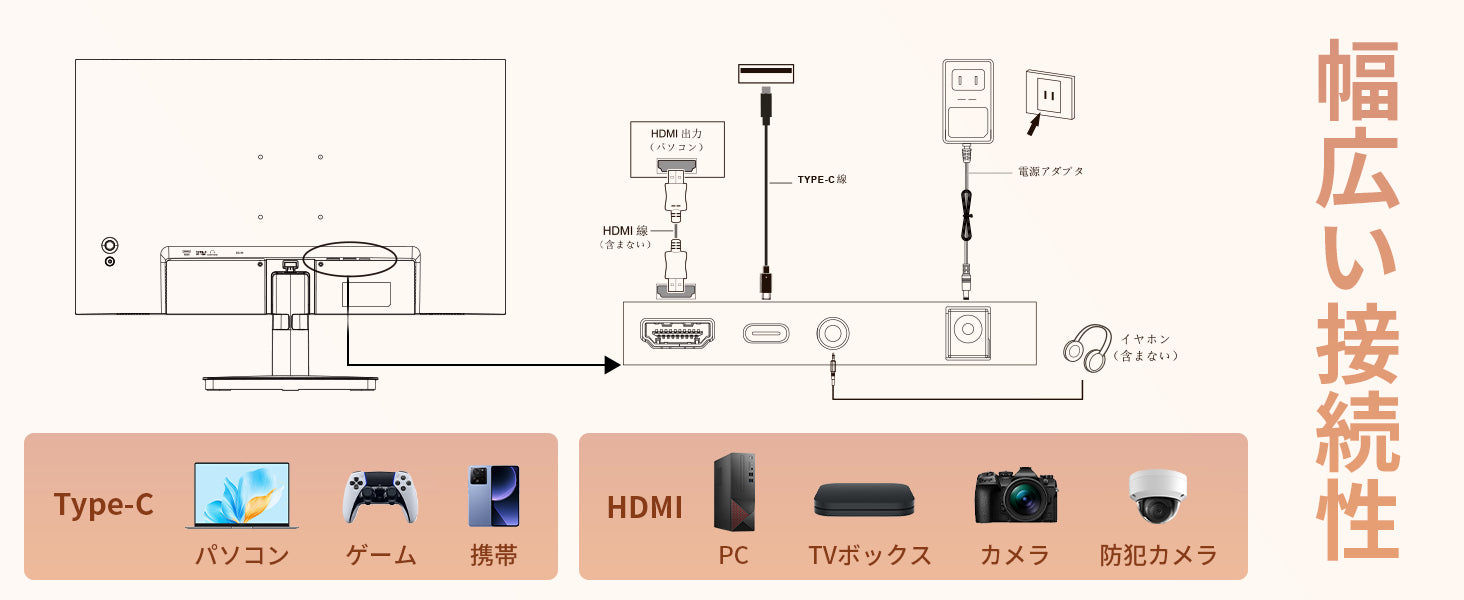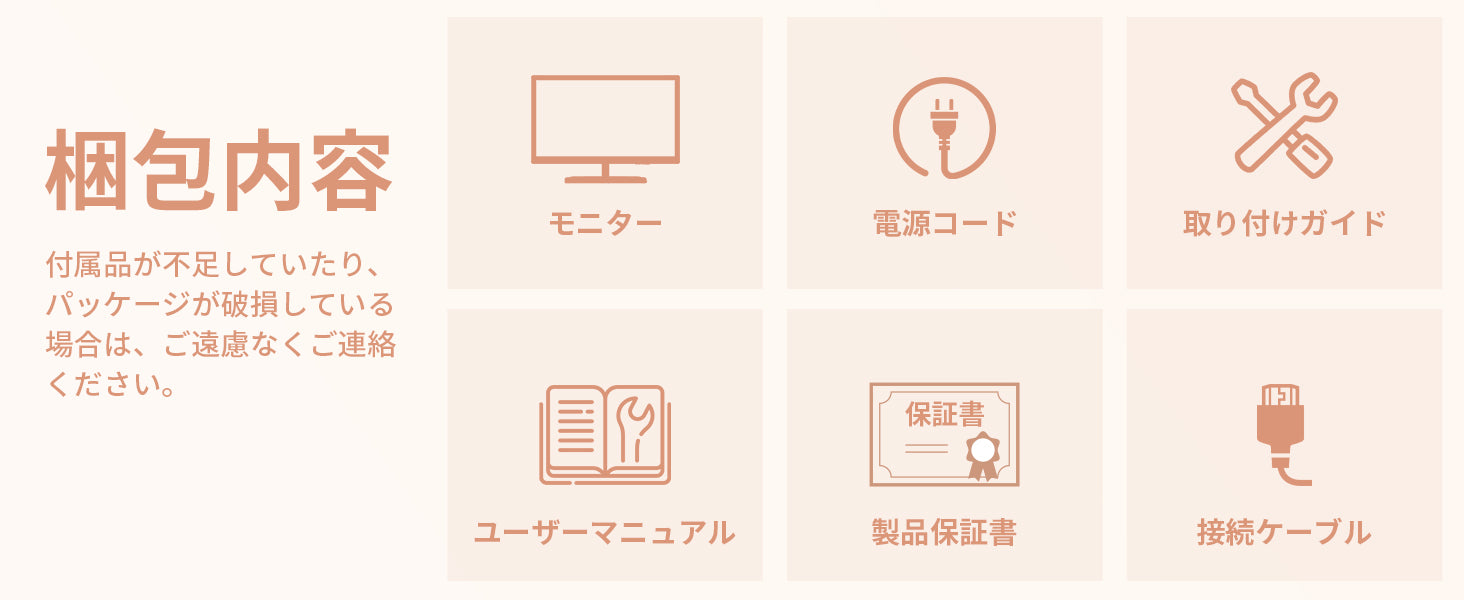 - 【入力端子】HDMI×1、VGA×1、DP×1、【出力端子】オーディオ出力、スピーカー、【主な付属品】USB Type-Cケーブル、アダプタ、スタンド、取扱説明書